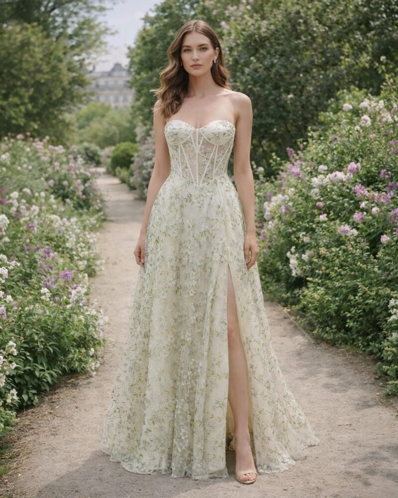Elevate your presence with this stunning Floral Corset Prom Dress, designed with Embroidered Lace to capture the essence of 2026 elegance. This Slit Gown is handcrafted to your specific measurements for a flawless silhouette.