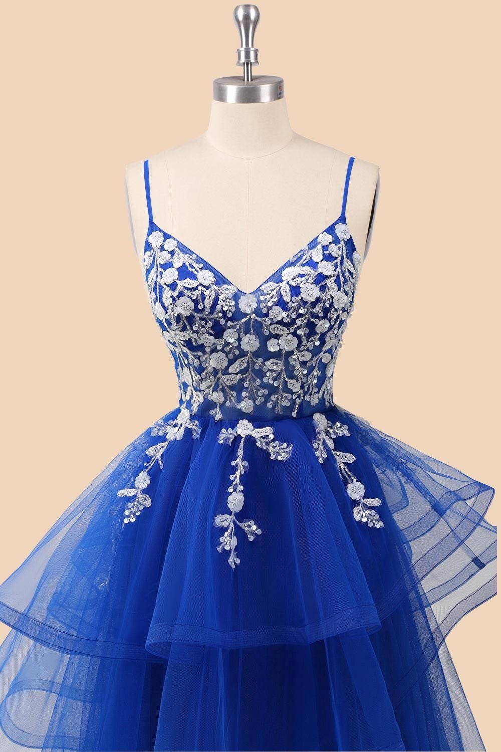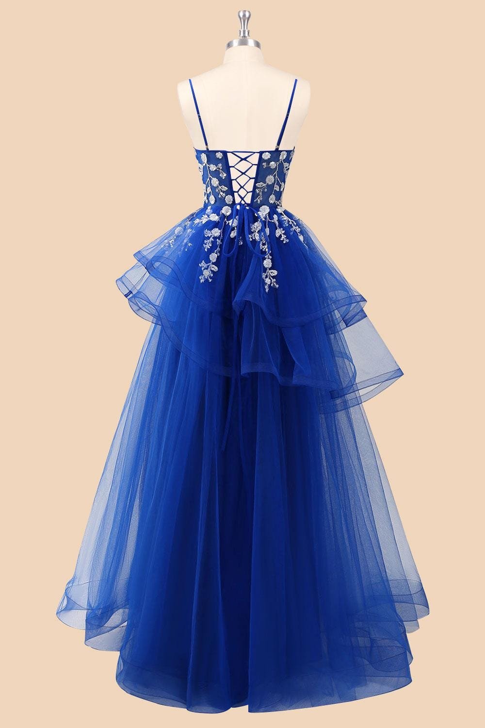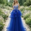 Custom Royal Blue Tiered Sequin Prom Dress Floral Embroidered Corset Tulle Evening Party Gown