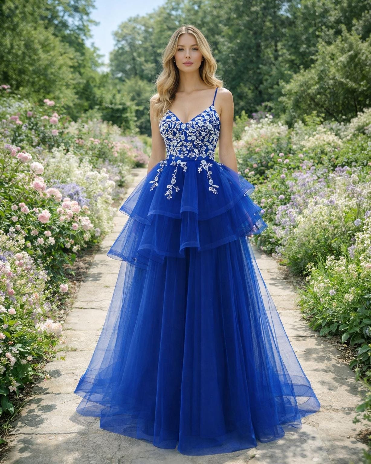 Elevate your presence with this stunning Royal Blue Tiered Dress, designed with Sequin Embroidery to capture the essence of 2026 elegance. This Tulle Gown is handcrafted to your specific measurements for a flawless silhouette.