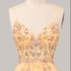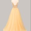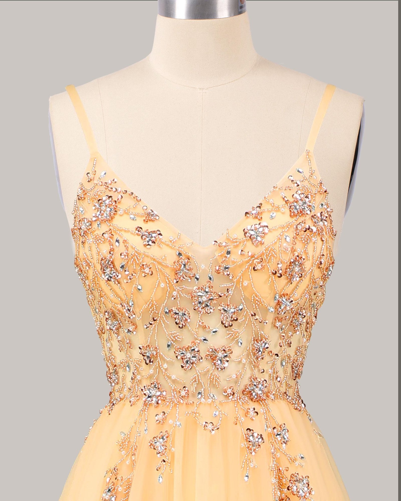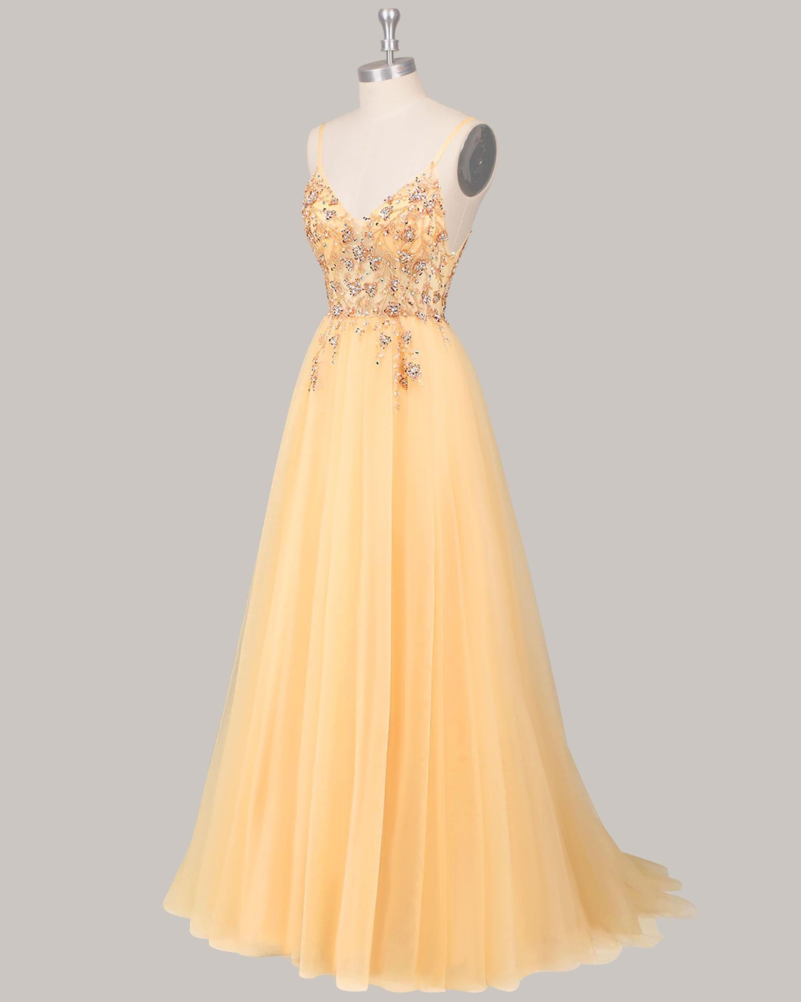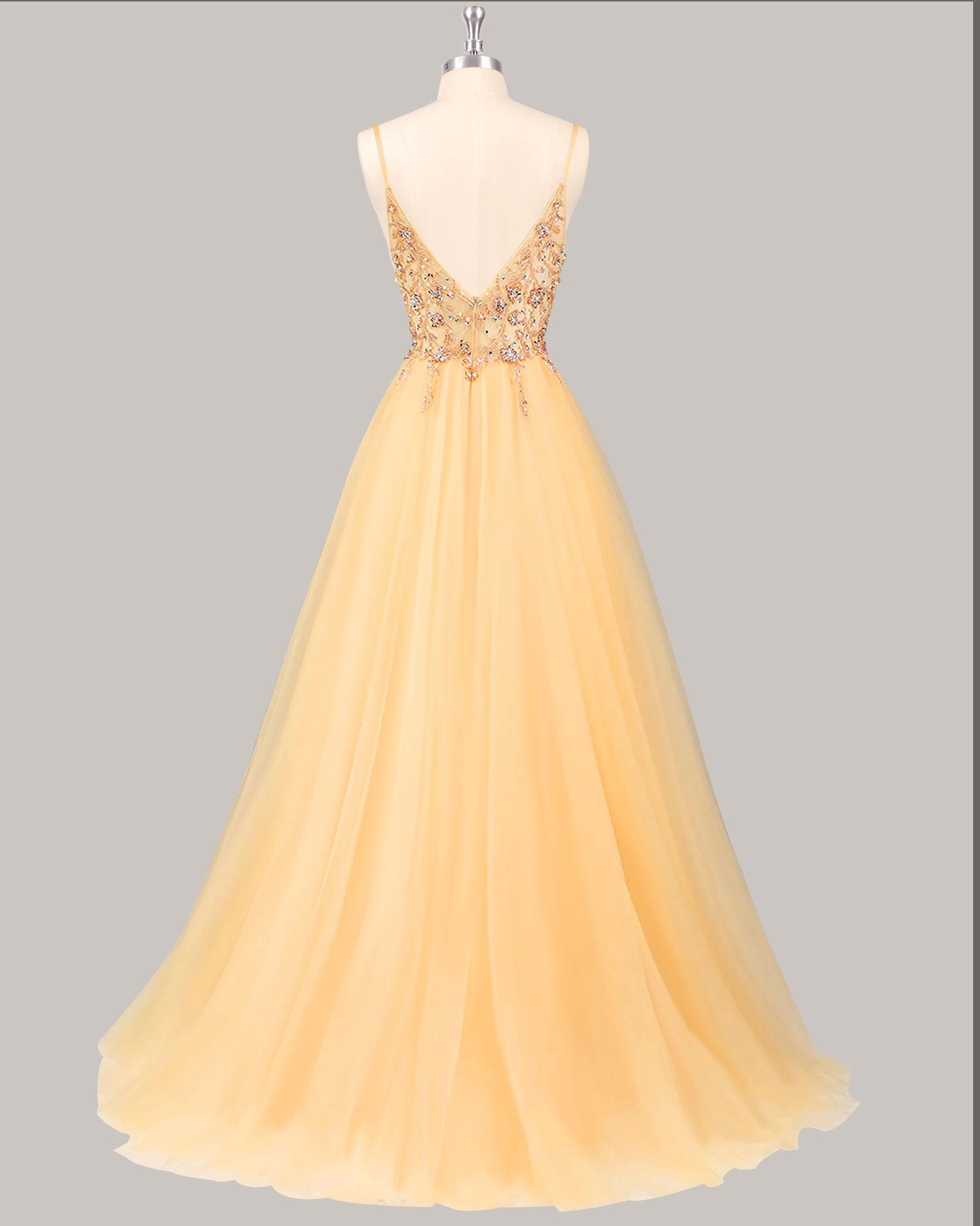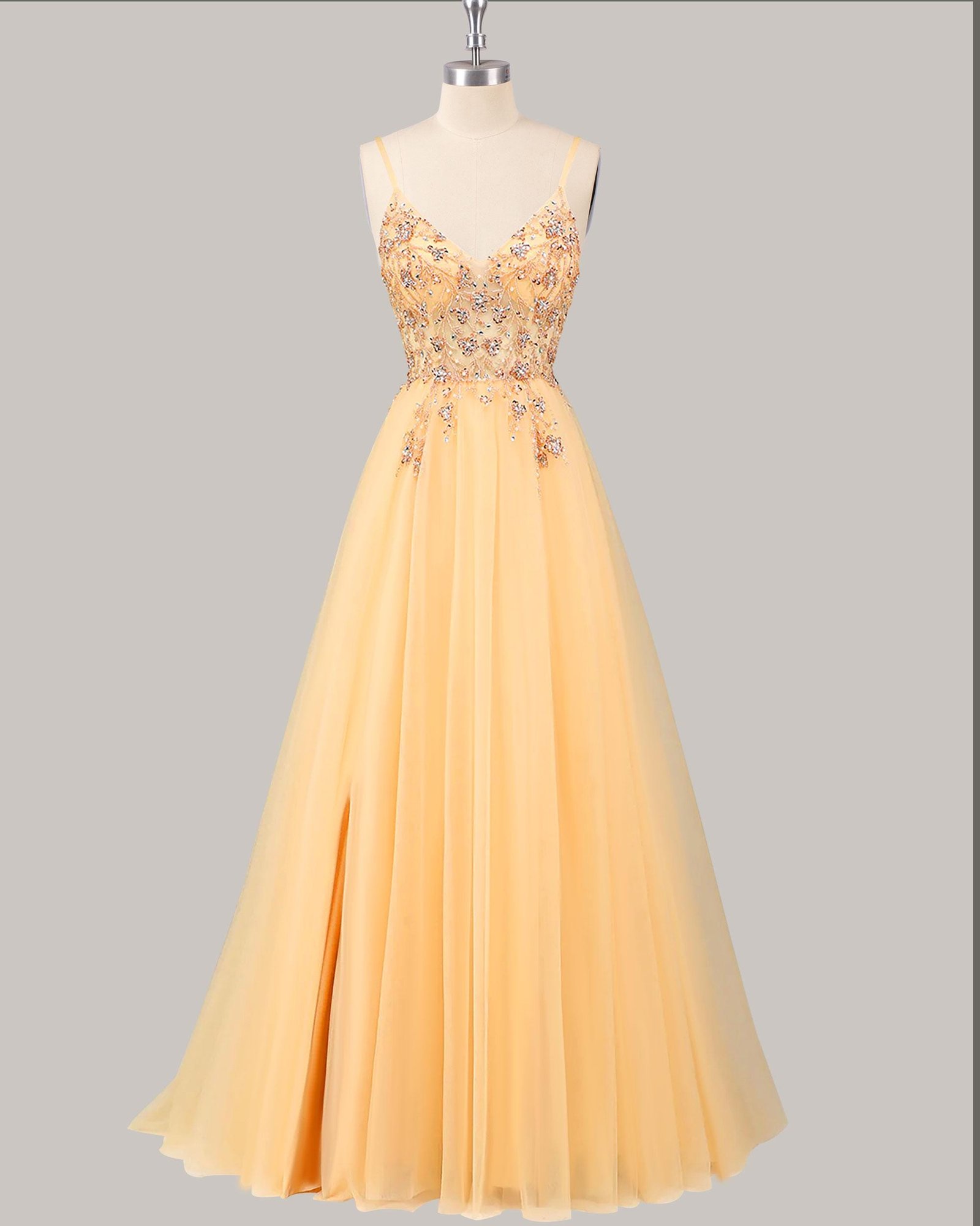 Custom Yellow Tulle Prom Dress with Lace Crystal Corset Slit Formal Evening Party Gown