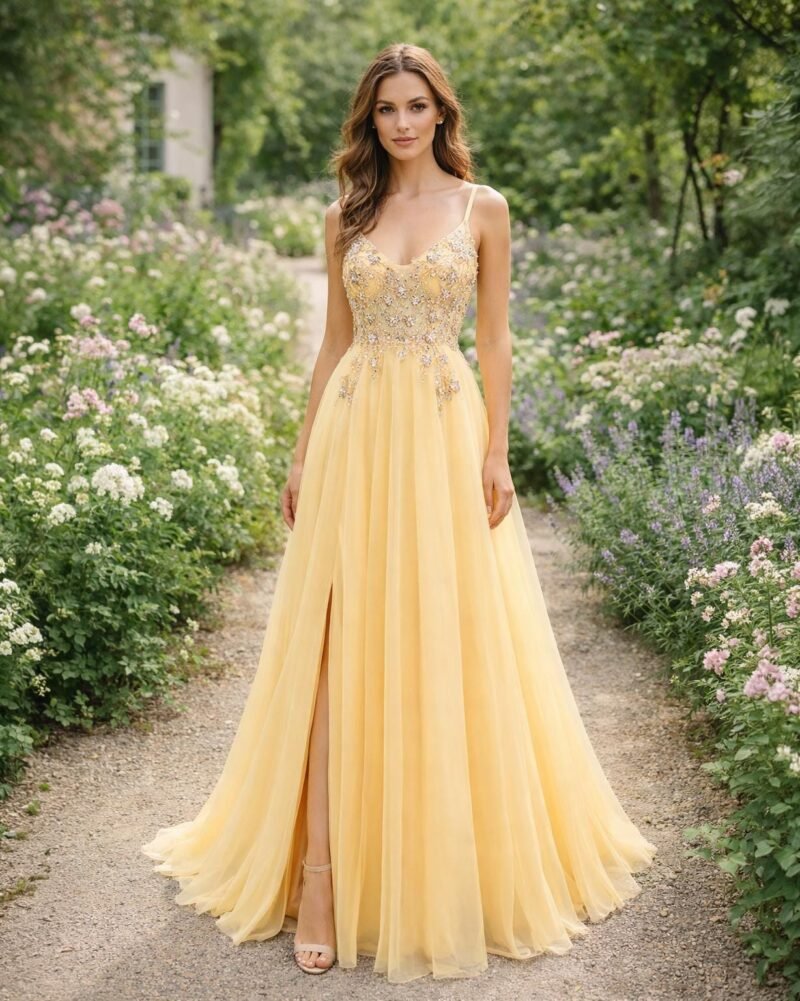 Elevate your presence with this stunning Yellow Tulle Prom Dress, designed with a Lace Crystal Corset to capture the essence of 2026 elegance. This Formal Gown is handcrafted to your specific measurements for a flawless silhouette.