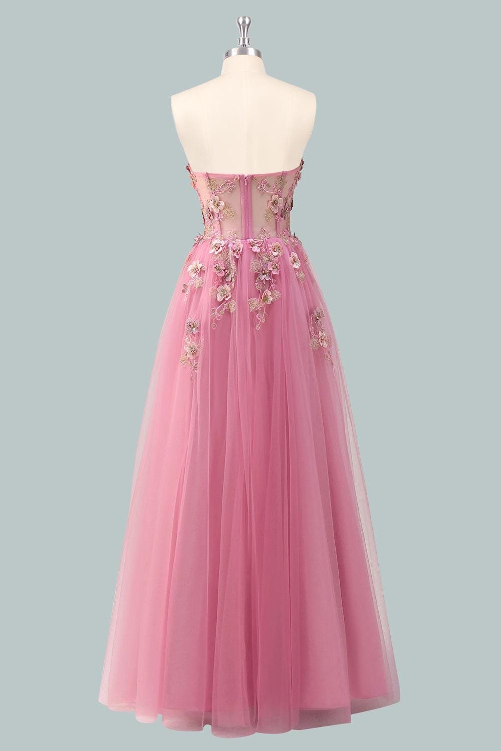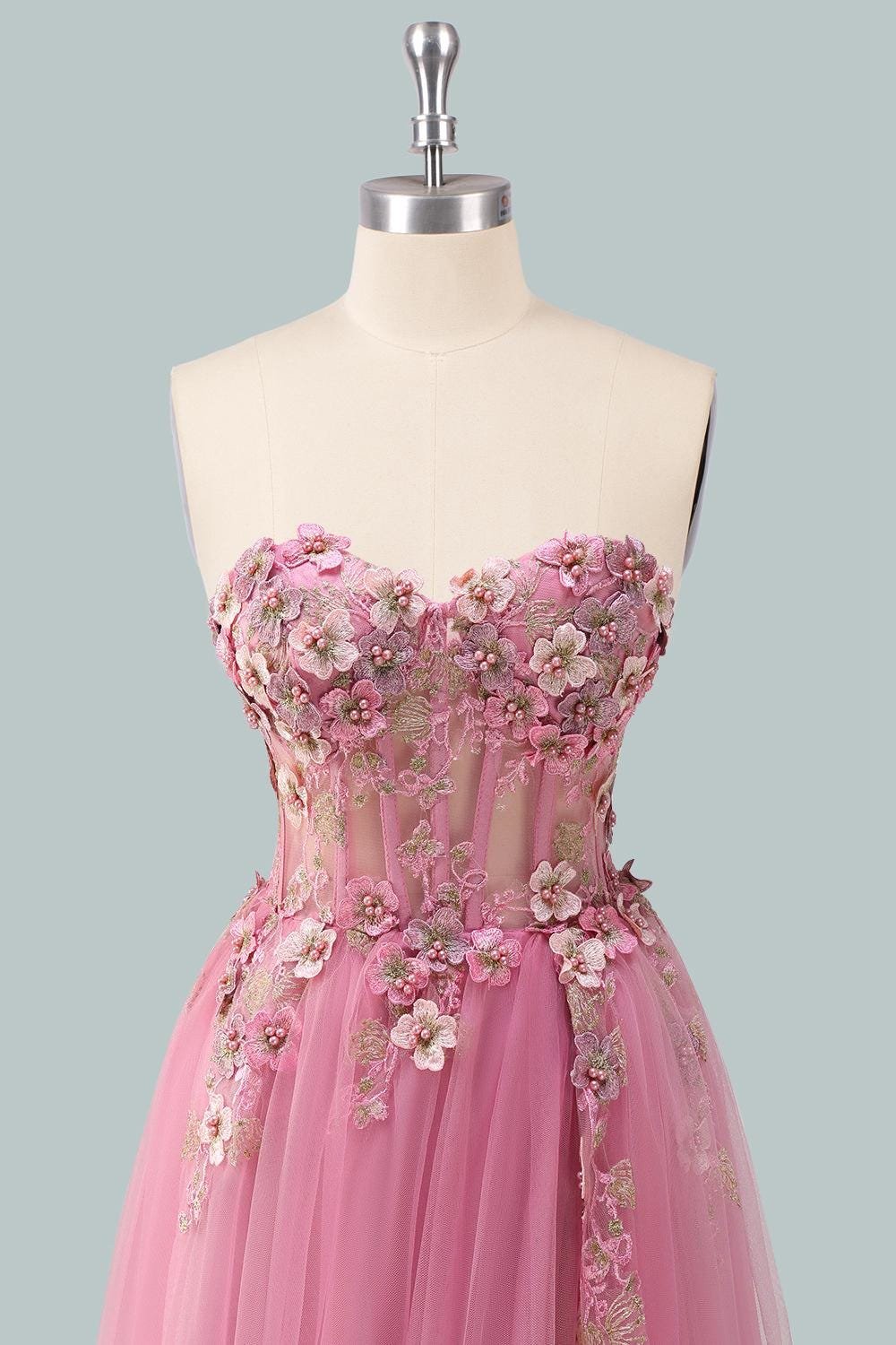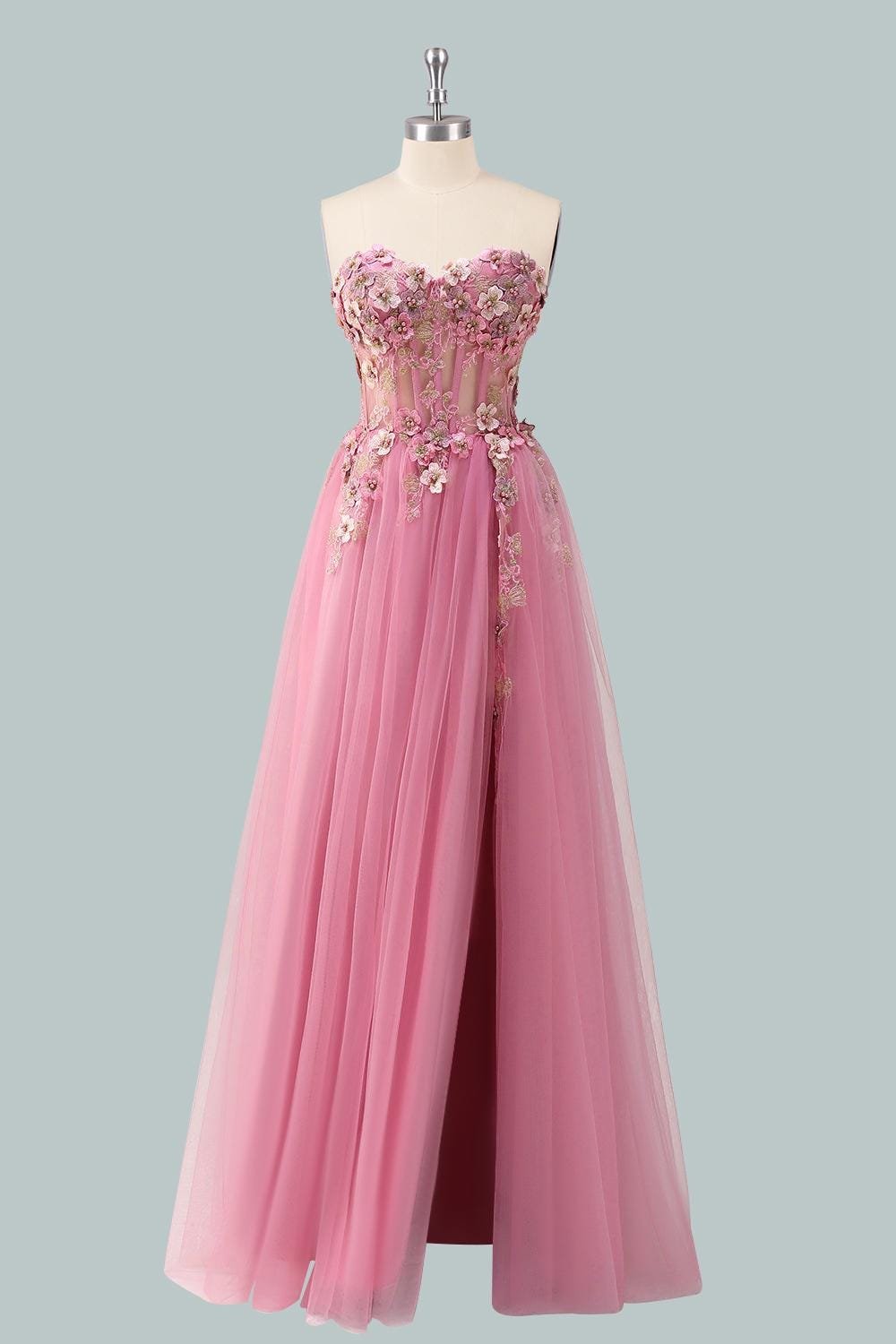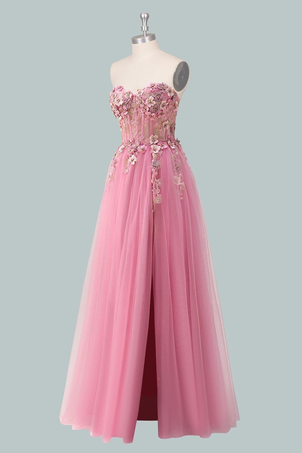 Pink Prom Dress 3D Floral Applique, Custom Made Beaded Evening Gown, Formal Gala Wear